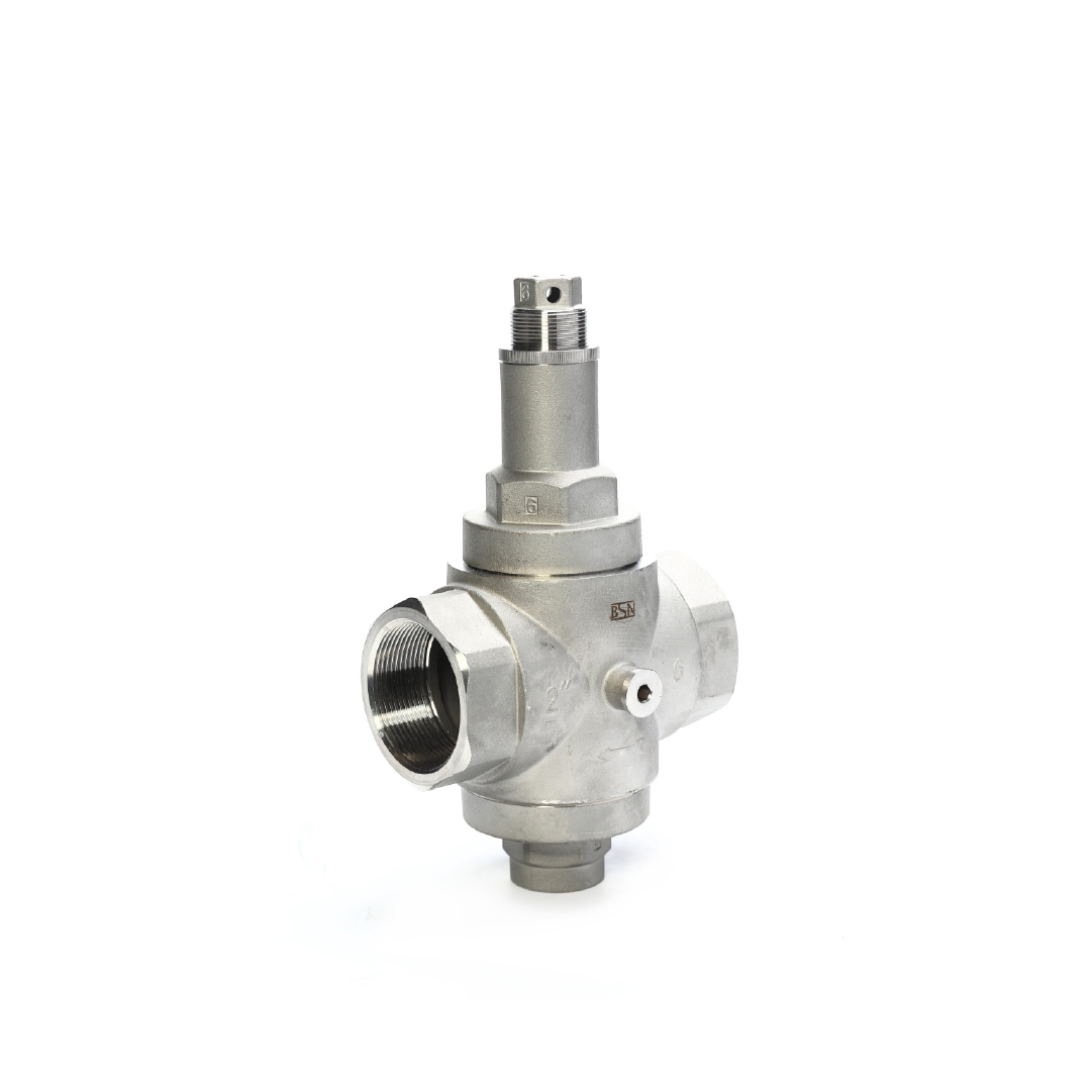 Our stainless steel pressure reducing valve features a stainless steel body, NBR seals, and is supplied with a pressure gauge that displays outlet pressure. Available in the following sizes: 1/2” (DN15), 3/4” (DN20), 1” (DN25), 1 1/2” (DN40), and 2” (DN50), with screwed BSPT connections.